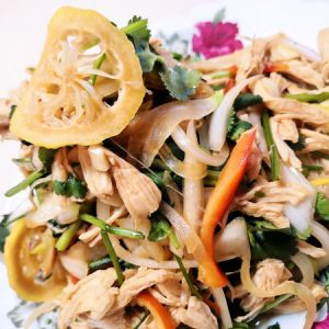 顺纹理撕成鸡丝,加入香菜,和配料拌匀