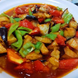 倒入茄子 尖椒 剩余部分的西红柿翻炒