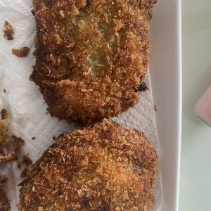 完成是这样的,中间没人给我照相,所以只能拍个成品,时间充裕的话,可以先吧肉饼冷冻一下,在蘸蛋液跟面包糠,好操作一点.也可以多做点冻起来,以后吃的时候拿出来直接炸就行
