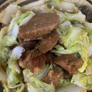 烧成这样差不多了、把五花肉和豆渣装进沙锅中、在把大白菜炒至变色在铺在豆渣上面即可