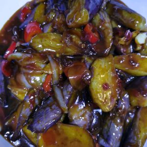 炒香配料后加少许高汤烧开下炸好的茄子大火煸炒一分钟