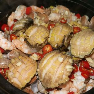 砂锅里首先放油蛤,依次放入鲍鱼,虾。再放入调好的蒜蓉姜末和小米椒。