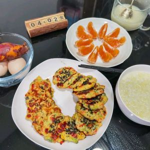 把胡萝卜山药隔水蒸熟,山药捣成泥,胡萝卜掰碎,西蓝花焯水剪下花朵部分,加面粉鸡蛋和在一起,加点盐。