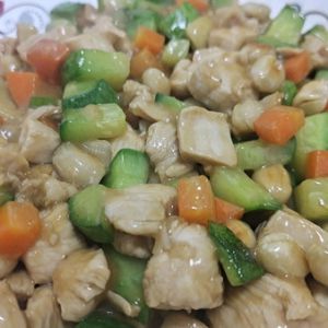 胡萝卜,黄瓜切丁。葱姜蒜爆锅,放入菜,炒断生后放入肉丁,快速翻炒打撒,熟后放花生米,倒汁,翻炒五分钟,出锅