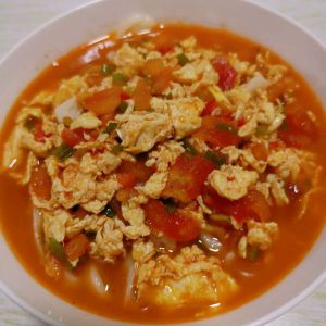 西红柿十字花刀,烫皮儿,去皮,切片,切块,葱切葱花,蒜瓣,鸡蛋打散