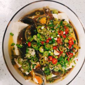 豆腐取出来直接化开,放上皮蛋,最上面放切碎的配菜,浇上热油,激发香味,再倒入酱油醋等