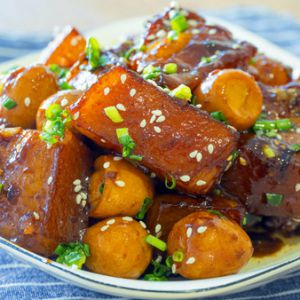 半个小时后锅里的汤汁也收干了,五花肉的颜色也变得超级好看了,最后再撒点白芝麻和小葱花点缀,香喷喷的元宝红烧肉就做好了。
