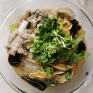 另起一个小锅舀入适量羊肉汤,先放入黄花,木耳煮一会儿放入粉丝青菜,放入蒜苗,白胡椒粉,生抽,藤椒油,鸡精就可以出锅了