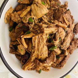 放入葱结,姜丝,八角,冰糖,老抽,生抽,料酒,少量白酒,倒入少量开水,小火煮沸。入切好的腐竹段。小火炖15分钟。最后大火收成浓汁,撒上葱花即可出锅