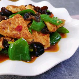 青椒切菱形片,木耳提前泡发,蒜切片备用