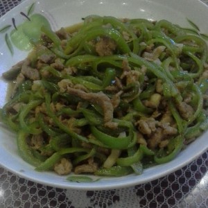 放入拍好的蒜泥,爆香,放入青椒,炒至变色后,放入肉丝一起煎炒几秒后,放水