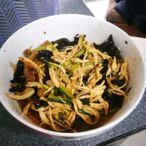 放凉的鸡肉,用手撕成丝,然后加入木耳丝黄瓜丝