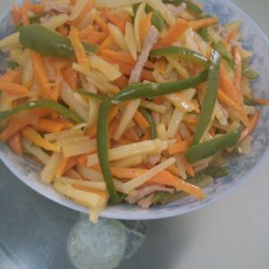 少许猪肉切条,放适量盐花生油酱油腌制十五分钟左右