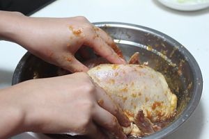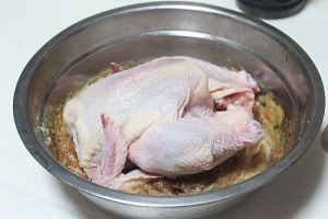 整只鸡放入腌料给鸡按摩个5分钟,鸡的内堂也要涂满