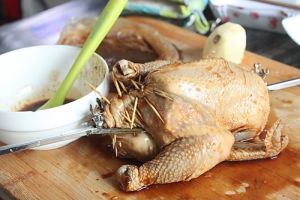 腌好的鸡外面涂一层生抽,糖,蚝油调制的酱汁,鸡肚子放入葱段和姜片,鸡屁股开口处用牙签封好