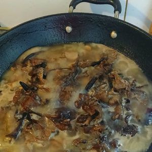 锅放油,把姜和蒜,大料先入锅炒香,放鸡肉,酱油上色,放入白酒,醋炒香,加水,开锅后煮10分钟后加入蘑菇,小火炖30分钟,出锅放盐。
