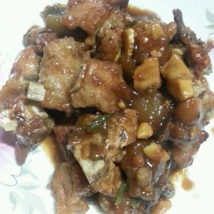 放油,油热放糖,待糖冒泡,将排骨放入,小心溅油。再放入葱姜蒜,翻炒