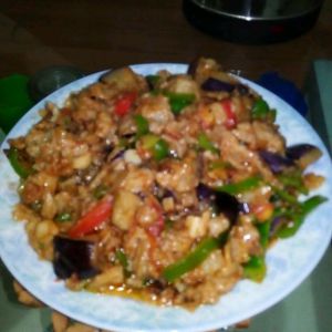 番茄青椒下锅炒,等差不多熟了放入炸好的茄子,加水,大火收汁