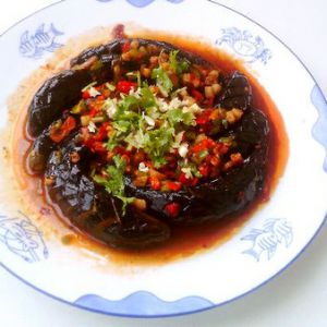 茄孑入锅,炒好肉沬入锅,加水适量,烧一会。大火收汁。