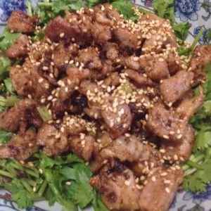 热锅 五分热的油 下肉 肉变色 加盐 加糖 炒 再加孜然粒 孜然粉 辣椒面