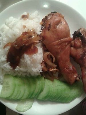 在盘子里盛上米饭,淋上烤汁(烤汁加点生粉,稍煮收汁),摆上鸡腿,再加点黄瓜,鸡腿饭大功告成!