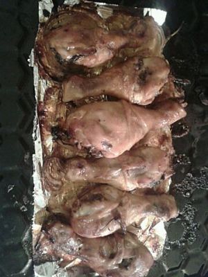 在烤盘里铺上锡纸,垫上一层洋葱片,把鸡腿均匀地铺在洋葱片上,烤箱预热五分钟,放入鸡腿,170度烤20分钟,取出翻个面,再烤20分钟,最后在一面淋上烤汁(蜂蜜:料酒:生抽:水=1:2:3:4)烤5分钟,接着另一面,完成!