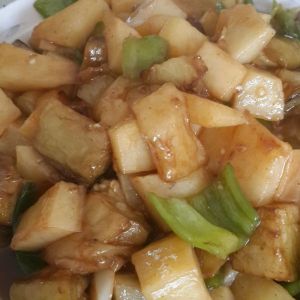 茄子出锅,留少量的油在锅里,放入辅料葱蒜等,翻炒后放入炸熟的土豆茄子,加调料,在加入适量的水炖菜,待菜快出锅时拌入淀粉,成品汁更浓