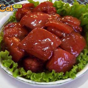 刮净皮上污物与余毛,放入沸水锅中焯一下,用冷水洗净,切成1.5厘米见方的肉块。