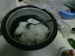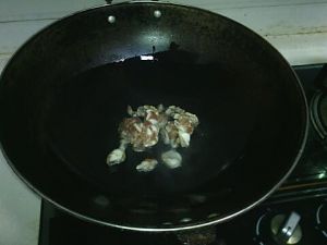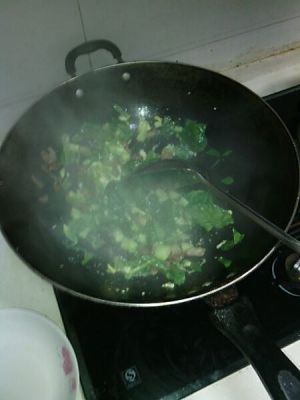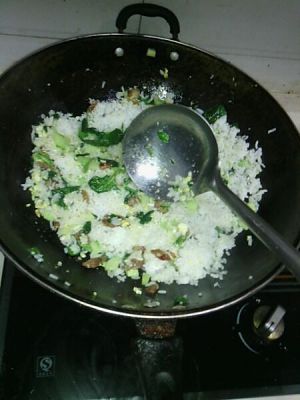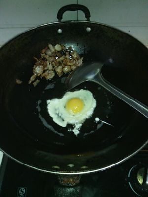 加饭。开炒。很多人喜欢把炒饭说的玄乎。就一点。要把空气炒进去。水汽炒出来,先在中火情况下把饭炒开。炒的不要有一块一块的饭团。然后开大火。不停的翻遍。有点底子的会颠锅的,会炒的比较快。底子一般的就用平铲多翻几下。一定保持大火。
