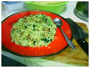 香肠泡水后切小粒,没葱了。用的蒜。。我太随意了哈哈。