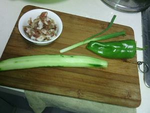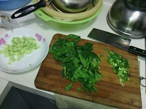 菠菜。黄瓜。葱。都切了。也不用纠结什么刀法了,小块均匀就好了,记得要把水分控干,尽量保持各种材料干燥。