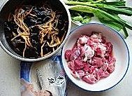 黑木耳、金针菜用水泡发,葱切断,姜切片,蒜切片,蒜苗切断,香菜切断。