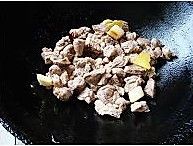 炒锅中放油,放葱、姜、蒜炒香,放入羊肉翻炒。