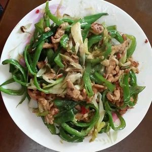 锅入少量油,放入大葱和青椒炒3分钟左右,炒至有点蔫放入一旁的肉丝下锅一起炒,加入盐,起锅前加入鸡精。