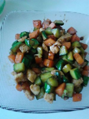 锅加热,加入少许色拉油然后倒入鸡丁,煸炒直至鸡肉变色盛出备用。然后再加少许油,放入胡萝卜丁用铲子不停翻炒两分钟左右,然后倒入黄瓜丁翻炒三十秒左右,关火。加入一勺黄豆酱一勺甜面酱半勺耗油,用铲子翻炒均匀,开火,加入鸡丁再翻炒半分钟左右,就大功告成。