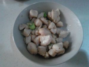 首先把黄瓜和胡萝卜洗净切成一厘米左右的小丁,大葱也切丁备用,把鸡肉洗净切丁放入碗中,加入2克白胡椒粉,切好的大葱,半勺色拉油,两勺料酒,半勺盐,5克红薯淀粉,用筷子拌匀腌制十分钟。