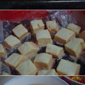 豆腐切块,篮子拿报纸和保鲜膜垫底,均匀放置,再铺报纸和保鲜膜,放豆腐。我铺了四层。盖好放在厨房
