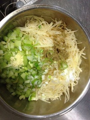 把土豆擦成丝,撒上莜麦面粉,上锅蒸20分钟