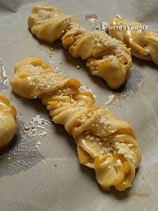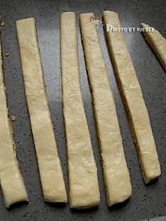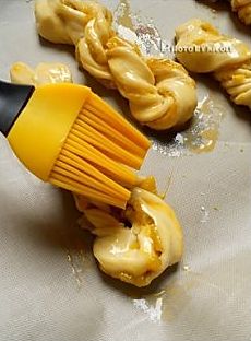 取1条,两手分别握住两头,稍拉长后,相反方向拧成麻花状,再对折绕在一起,摆在铺好高温布的烤盘上,进行二次发酵;