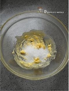 10g黄油室温软化后稍稍打软,加入10g细砂糖;