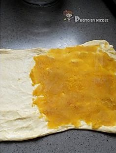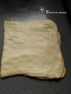 松弛后的面团擀成长方形,翻面后压薄底边,在1/2的面积上铺上红薯馅;
