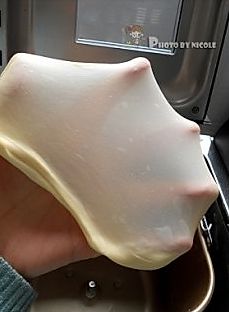 将除黄油以外的所有原料放在一起打至面筋扩展表面光滑后,加入黄油,打至扩展阶段;