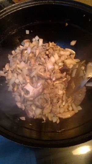 2。上锅,油适量,先将姜葱爆香,下肉,炒啊炒一会儿肉就出油了。等出油之后放洋葱和香菇,再炒炒。