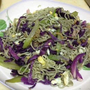 把紫甘蓝和芹菜炒到七分熟,然后倒入煮过的面条翻炒,注意火不要太大,起锅放入胡椒和盐即可。