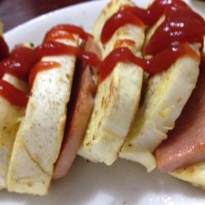 面包片煎两面金黄,有点硬就盛到盘里,将火腿肠夹入两个馒头片中,在上面撒少许孜然粉和胡椒粉,最后淋上番茄酱,这样馒头三明治就大功告成了