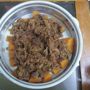 第五步:将腌制后的肉,与碾碎后香米拌匀,放入蒸笼上,底面放南瓜。建议中间空一坑,容易熟。