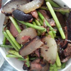 锅里放少许油,烧热后放入蒜苔翻炒至断生,加少许盐再翻炒。然后倒入腊肉,翻炒均匀后加少许白糖,起锅前加少许味精即可