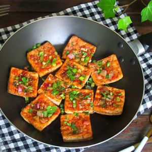 将电饼铛或平底锅预热,放入臭豆腐煎至两面金黄