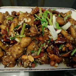 炒鸡多的油锅(不要太多),倒入干辣椒和花椒,小火翻炒,有香味时放入姜,蒜炒。
