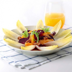 红菜头去皮切块,橙子去皮起肉,平均放在菊苣上,伴以色拉汁同吃。